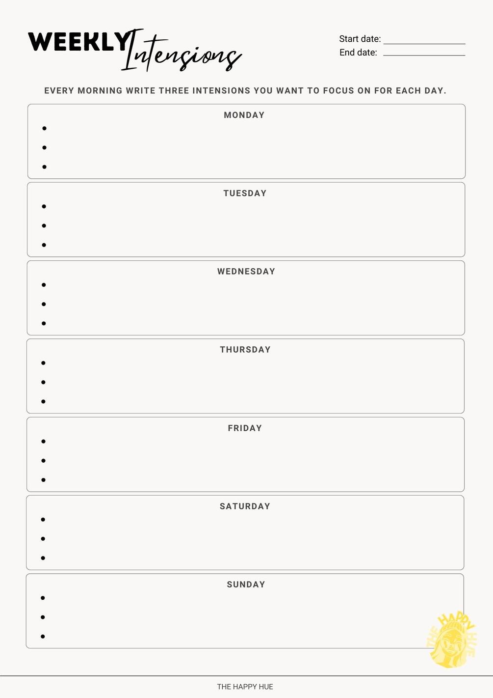 You'll get three different weekly worksheets of daily intension setting that you can print out as many times as you'd like to help you focus on what your intensions for each day is.